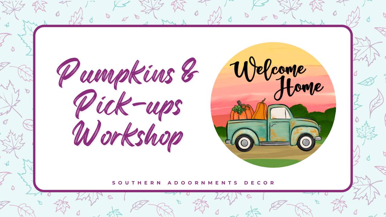We are painting this beautiful Pumpkins & Pick-ups door hanger in our upcoming workshop!